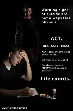 The traditional approach has been to identify the risk factors that increase suicide or self-harm, though meta-analysis studies suggest that suicide risk assessment might not be useful and recommend immediate hospitalization of the person with suicidal feelings as the healthy choice.[14] In 2001, the U.S. Department of Health and Human Services, published the National Strategy for Suicide Prevention, establishing a framework for suicide prevention in the U.S. The document, and its 2012 revision, calls for a public health approach to suicide prevention, focusing on identifying patterns of suicide and suicidal ideation throughout a group or population (as opposed to exploring the history and health conditions that could lead to suicide in a single individual).[15] The ability to recognize warning signs of suicide allows individuals who may be concerned about someone they know to direct them to help.[16]