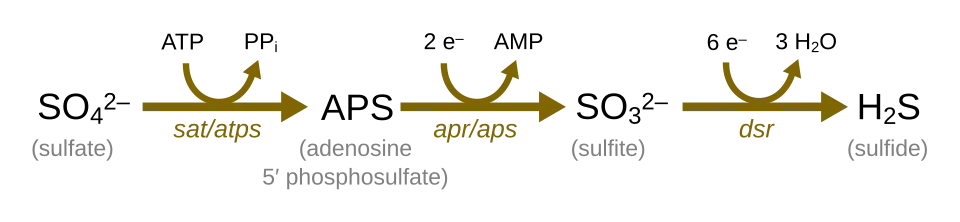 Before sulfate can be used as an electron acceptor, it must be activated. This is done by the enzyme ATP-sulfurylase, which uses ATP and sulfate to create adenosine 5′-phosphosulfate (APS). APS is subsequently reduced to sulfite and AMP. Sulfite is then further reduced to sulfide, while AMP is turned into ADP using another molecule of ATP. The overall process, thus, involves an investment of two molecules of the energy carrier ATP, which must to be regained from the reduction.[1]