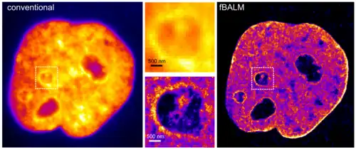 Binding-activated localization microscopy (BALM) is a general concept for single-molecule localization microscopy (SMLM): super-resolved imaging of DNA-binding dyes based on modifying the properties of DNA and a dye.[86] By careful adjustment of the chemical environment—leading to local, reversible DNA melting and hybridization control over the fluorescence signal—DNA-binding dye molecules can be introduced. Intercalating and minor-groove binding DNA dyes can be used to register and optically isolate only a few DNA-binding dye signals at a time. DNA structure fluctuation-assisted BALM (fBALM) has been used to nanoscale differences in nuclear architecture, with an anticipated structural resolution of approximately 50 nm. Imaging chromatin nanostructure with binding-activated localization microscopy based on DNA structure fluctuations.[87] Recently, the significant enhancement of fluorescence quantum yield of NIAD-4 upon binding to an amyloid was exploited for BALM imaging of amyloid fibrils[88] and oligomers.[89]