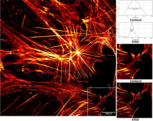 - ↑ Schmidt R, Wurm CA, Jakobs S, Engelhardt J, Egner A, Hell SW (June 2008). "Spherical nanosized focal spot unravels the interior of cells". Nature Methods. 5 (6): 539–44. doi:10.1038/nmeth.1214. hdl:11858/00-001M-0000-0012-DBBB-8. PMID 18488034. S2CID 16580036.