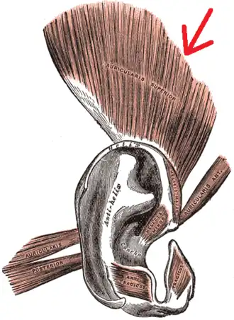 ![]() The muscles of the auricula. Superior auricular is at top (indicated by the red arrow). | |