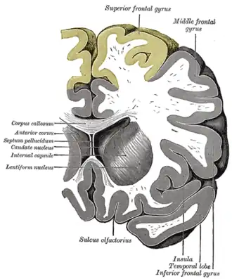 ![]() Coronal section through anterior cornua of lateral ventricles. Superior frontal gyrus is shown as yellow. | |