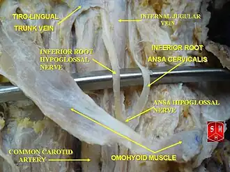 ![]() Ansa cervicalis. Superior root labeled as "descending hypoglossal," Inferior root labeled as "descending cervical." | |
