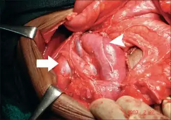 | Arrow pointing to right kidney. Arrow head pointing to right half of the horse shoe kidney | |