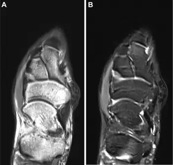 | a,b)MRI appearance of surfers' knot medial to the persons' navicular | |