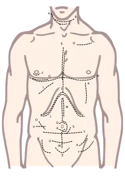 Incisions of the neck, chest, and abdomen. Key as follows: