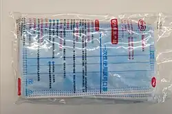 In China, two types of masks are common: surgical masks that conform to YY 0469 standard (BFE ≥ 95%, PFE ≥ 30%, splash resistance) and single-use medical masks that conform to YY/T 0969 standard (BFE ≥ 95%).[39][94] Daily protective masks conforming to GB/T 32610 standard[95] is yet another type of masks that can have similar appearance to surgical masks.