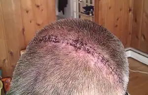 | 34 surgical staples closing scalp following craniotomy | |