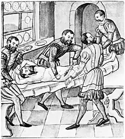 The earliest reports of surgical suture date to 3000 BC in ancient Egypt, and the oldest known suture is in a mummy from 1100 BC. A detailed description of a wound suture and the suture materials used in it is by the Indian sage and physician Sushruta, written in 500 BC.[26] The Greek father of medicine, Hippocrates, described suture techniques, as did the later Roman Aulus Cornelius Celsus. The 2nd-century Roman physician Galen described sutures made of surgical gut or catgut.[27] In the 10th century, the catgut suture along with the surgery needle were used in operations by Abulcasis.[28][29] The gut suture was similar to that of strings for violins, guitars, and tennis racquets and it involved harvesting sheep or cow intestines. Catgut sometimes led to infection due to a lack of disinfection and sterilization of the material.[30]