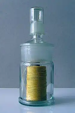 The next great leap came in the twentieth century. The chemical industry drove production of the first synthetic thread in the early 1930s, which exploded into production of numerous absorbable and non-absorbable synthetics. The first synthetic absorbable was based on polyvinyl alcohol in 1931. Polyesters were developed in the 1950s, and later the process of radiation sterilization was established for catgut and polyester. Polyglycolic acid was discovered in the 1960s and implemented in the 1970s. Today, most sutures are made of synthetic polymer fibers. Silk and, rarely, gut sutures are the only materials still in use from ancient times. In fact, gut sutures have been banned in Europe and Japan owing to concerns regarding bovine spongiform encephalopathy. Silk suture is still used today, mainly to secure surgical drains.[31]
