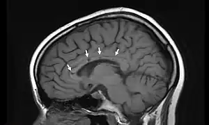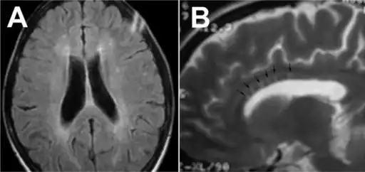 | Sagittal T1 image in a 19-year-old woman with Susac's syndrome showing the pathognomonic central callosal "holes" (microinfarcts) of SS. These residual "holes" (and sometimes, "spokes") develop as the acute callosal changes resolve. | |