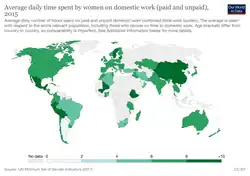 Unpaid care and domestic work includes cooking and cleaning, fetching water and firewood or taking care of children and the elderly.[15]: 6 Data from 2020 showed that "women already spend three times as many hours as men on unpaid care work at home".[16]: 8