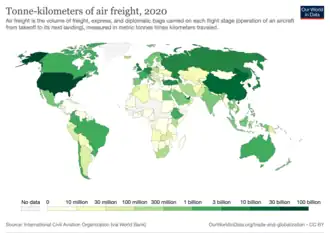 World map for Indicator 9.1.2 in 2017: Air transport, freight(ton-km)[13]