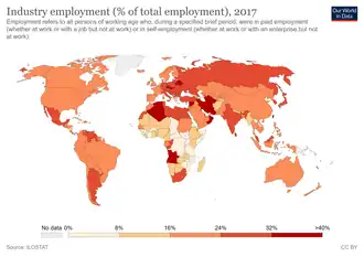 SDG Indicator 9.2.2 as at 2017: Industry employment (% of total employment).[13]