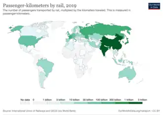 World map for Indicator 9.1.2 in 2014: Railways, passengers carried (passenger-km)[13]