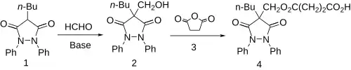 Phenylbutazone [50-33-9] (1) is hydroxymethylated with formaldehyde giving ~86% 4-butyl-4-(hydroxymethyl)-1,2-diphenylpyrazolidine-3,5-dione [23111-33-3] (2). This is then esterified with succinic anhydride. [108-30-5] (3) to give (4).