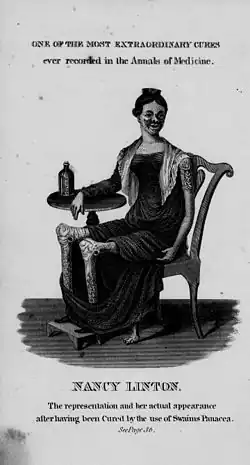 Swaim used a symbol of Hercules killing the Hydra in early advertisements of his product, which was being sold in rectangular bottles by 1825, and in green cylindrical bottles by 1829.[13] Swaim advertised heavily, and took advantage of developments in commercial lithography in the 1830s to advertise his concoction with a portrait of a woman named Nancy Linton, advertising her "actual appearance" after being cured. The panacea contained the undisclosed active ingredient mercury dichloride, as Linton's grotesque appearance appears to reflect signs of mercury poisoning.[14] Mercury dichloride (called corrosive sublimate at the time) did have a prior history of being used to treat syphilis. Oil of wintergreen and sarsaparilla were also prominent ingredients of Swaim's product.[15]