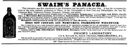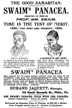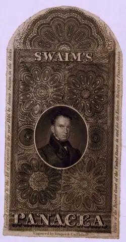 Swaim's Panacea (also called Swaim's Celebrated Panacea) was an American patent medicine sold by William Swaim (1781–1846)[2] of Philadelphia, starting in approximately 1820, with formulations still being sold into the 1920s. It was advertised to cure various diseases including scrofula, syphilis and rheumatism.[3][4]