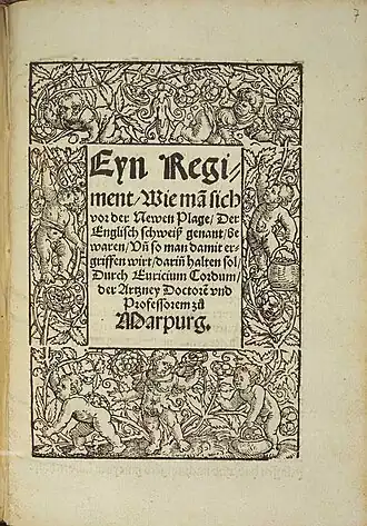 The last major outbreak of the disease occurred in England in 1551.[34] Although burial patterns in smaller towns in Europe suggest that the disease may have been present elsewhere first,[5] the outbreak is recorded to have begun in Shrewsbury in April.[15] It killed around 1,000 there, spreading quickly throughout the rest of England,[3] all but disappearing by October.[3] It was more prevalent among younger men than other groups, possibly due to their greater social exposure.[3] John Caius wrote his eyewitness account A Boke or Counseill Against the Disease Commonly Called the Sweate, or Sweatyng Sicknesse. Henry Machin also recorded it in his diary: