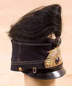 In 1806 a dark blue tunic with turned up tails and two rows of buttons on the chest. In 1845 a tunic of dark blue broadcloth, single breasted with eight buttons, open and slanted Prussian collar with a red flap on each side, red piping in the front from the collar and all the way down, around the cuffs and on the pocket flaps. Epaulettes of earlier model were worn. The trousers were of dark blue broadcloth with a red piping along the outer seam. For summer use, trousers of linen or other white fabric were used. In 1886 military surgeons got tunic m/1886 with black lining, collar and cuffs of black velvet and with three blind button holes on each cuff. Red piping along the front edge of the tunic, on the Prussian collar and around the cuffs. Epaulette straps were of golden braid and lined with red cloth. Alternatively a dark blue coat m/1888, double breasted with five buttons in each row, no cuffs and with pleated gilded shoulder straps or surtout m/1829–1854, double breasted with eight buttons in each row could be worn. Trousers m/1872 had red piping in the outer seams. Greatcoat m/1886 was of grey broadcloth. Later greatcout m/04 of greybrown-green broadcloth and with grey lining might be worn. Cap m/1865–1899 with cockade and cap button m/1865 could at parade be furnished with pom-pom and a drooping plume m/1865 of black horse hair.[5]
