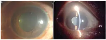 Ocular synechia is an eye condition where the iris adheres to either the cornea (i.e. anterior synechia) or lens (i.e. posterior synechia)[1]. Synechiae can be caused by ocular trauma, iritis or iridocyclitis and may lead to certain types of glaucoma. It is sometimes visible on careful examination but usually more easily through an ophthalmoscope or slit-lamp.