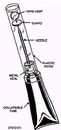 In WWII, the morphine syrette was included in first aid kits. It had a wire loop with a guard at the end of a hollow needle that was used to break a seal where the needle was attached to the tube. The wire loop was then removed and the needle was inserted under the skin at a shallow angle and the tube slowly squeezed from the sealed end (see subcutaneous injection).[2] After injection the used tube was often pinned to the receiving soldier's collar to inform others of the dose administered.[1]