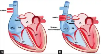 Diagrammatic representation of Warden repair- a) Reveals two partial anomalous pulmonary venous connections to superior vena cava and presence of atrial septal defect b) Warden procedure is depicted.