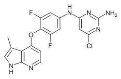 • CC1=CNC2=NC=CC(=C12)OC3=C(C=C(C=C3F)NC4=CC(=NC(=N4)N)Cl)F