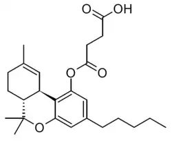 THC hemisuccinate (Δ9-THC-O-hemisuccinate, Dronabinol hemisuccinate) is a synthetic derivative of tetrahydrocannabinol, developed in the 1990s. It is a water-soluble prodrug ester which is converted into THC inside the body, and was developed to overcome the poor bioavailability of THC when taken by non-inhaled routes of administration.[1][2][3] In medical applications it has mainly been formulated as rectal suppositories.[4][5][6]