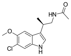 - 1 2 3 4 5 6 7 8 Mulchahey JJ, Goldwater DR, Zemlan FP (August 2004). "A single blind, placebo controlled, across groups dose escalation study of the safety, tolerability, pharmacokinetics and pharmacodynamics of the melatonin analog beta-methyl-6-chloromelatonin". Life Sciences. 75 (15): 1843–1856. doi:10.1016/j.lfs.2004.03.023. PMID 15302228.