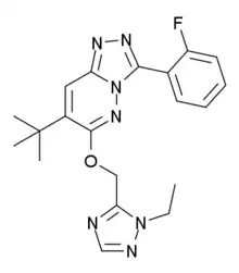 - ↑ Carling RW, Madin A, Guiblin A, Russell MG, Moore KW, Mitchinson A, et al. (November 2005). "7-(1,1-Dimethylethyl)-6-(2-ethyl-2H-1,2,4-triazol-3-ylmethoxy)-3-(2-fluorophenyl)-1,2,4-triazolo[4,3-b]pyridazine: a functionally selective gamma-aminobutyric acid(A) (GABA(A)) alpha2/alpha3-subtype selective agonist that exhibits potent anxiolytic activity but is not sedating in animal models". Journal of Medicinal Chemistry. 48 (23): 7089–92. doi:10.1021/jm058034a. PMID 16279764.
