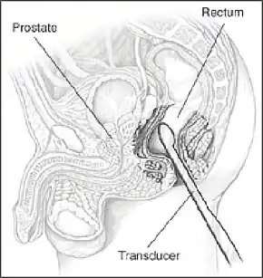 ![]() A probe inserted in the rectum emits sound waves to image the prostate | |