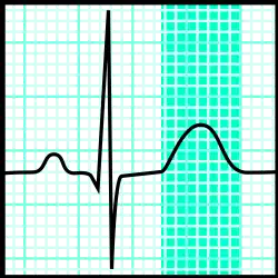 In electrocardiography, the T wave represents the repolarization of the ventricles. The interval from the beginning of the QRS complex to the apex of the T wave is referred to as the absolute refractory period. The last half of the T wave is referred to as the relative refractory period or vulnerable period. The T wave contains more information than the QT interval. The T wave can be described by its symmetry, skewness, slope of ascending and descending limbs, amplitude and subintervals like the Tpeak–Tend interval.[1]
