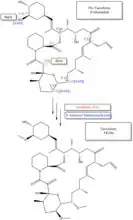 {{cite journal}}: CS1 maint: unflagged free DOI (link) - ↑ Chen D, Zhang L, Pang B, Chen J, Xu Z, Abe I, Liu W (May 2013). "FK506 maturation involves a cytochrome p450 protein-catalyzed four-electron C-9 oxidation in parallel with a C-31 O-methylation". Journal of Bacteriology. 195 (9): 1931–9. doi:10.1128/JB.00033-13. PMC 3624582. PMID 23435975.