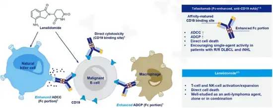 In terms of the mode of action we find that Tafasitamab binds to the CD19 antigen on surface of pre-B/mature B lymphocytes.Then Tafasitamab mediates B-cell lysis via, apoptosis, ADCC and ADCP. Lenalidomide enhances the activity of immune cells (natural killer cell or macrophages), leading to increased ADCC activity compared to tafasitamab alone[7][6]