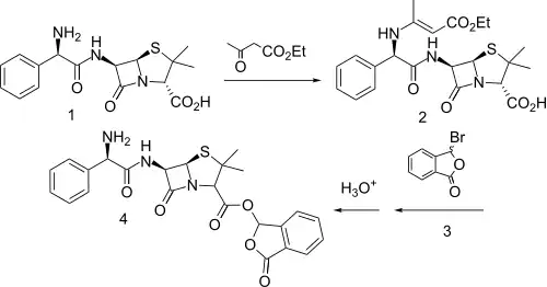 One synthesis involved protecting the primary amino group of ampicillin (1) as the enamine with ethyl acetoacetate (2). THis was then esterified by reaction with 3-bromopthalide (3), and the enamine was carefully hydrolyzed with dilute HCl in acetonitrile to produce talampicillin (4).