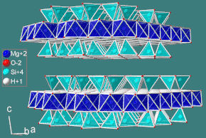 Talc is a trioctahedral layered mineral; its structure is similar to pyrophyllite, but with magnesium in the octahedral sites of the composite layers.[1]