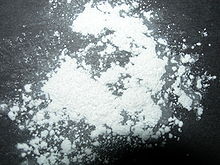 Talc, or talcum, is a clay mineral, composed of hydrated magnesium silicate with the chemical formula Mg3Si4O10(OH)2. Talc in powdered form, often combined with corn starch, is used as baby powder. This mineral is used as a thickening agent and lubricant; is an ingredient in ceramics, paint, and roofing material; and is a main ingredient in many cosmetics.[5] It occurs as foliated to fibrous masses, and in an exceptionally rare crystal form. It has a perfect basal cleavage and an uneven flat fracture, and it is foliated with a two-dimensional platy form.
