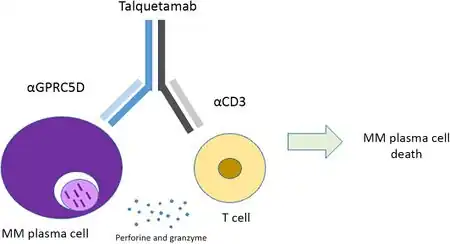 - ↑ Chari A, Minnema MC, Berdeja JG, Oriol A, van de Donk NW, Rodríguez-Otero P, Askari E, Mateos MV, Costa LJ, Caers J, Verona R, Girgis S, Yang S, Goldsmith RB, Yao X, Pillarisetti K, Hilder BW, Russell J, Goldberg JD, Krishnan A (December 2022). "Talquetamab, a T-Cell-Redirecting GPRC5D Bispecific Antibody for Multiple Myeloma". The New England Journal of Medicine. 387 (24): 2232–2244. doi:10.1056/NEJMoa2204591. PMID 36507686. S2CID 254560960.