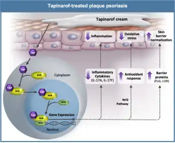 5. 5.0 5.1 Bissonnette, Robert; Stein Gold, Linda; Rubenstein, David S.; Tallman, Anna M.; Armstrong, April (1 April 2021). "Tapinarof in the treatment of psoriasis: A review of the unique mechanism of action of a novel therapeutic aryl hydrocarbon receptor–modulating agent". Journal of the American Academy of Dermatology. 84 (4): 1059–1067. doi:10.1016/j.jaad.2020.10.085. ISSN 0190-9622. Archived from the original on 18 December 2023. Retrieved 18 August 2024.