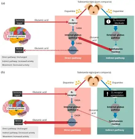 Tardive dyskinesia was first described in the 1950s shortly after the introduction of chlorpromazine and other antipsychotic drugs.[18] However, the exact mechanism of the disorder remains largely uncertain. The most compelling line of evidence suggests that tardive dyskinesia may result primarily from neuroleptic-induced dopamine supersensitivity in the nigrostriatal pathway, with the D2 dopamine receptor being most affected. Neuroleptics act primarily on this dopamine system, and older neuroleptics, which have greater affinity for the D2 binding site, are associated with high risk for tardive dyskinesia.[19] The D2 hypersensitivity hypothesis is also supported by evidence of a dose–response relationship, withdrawal effects, studies on D2 agonists and antagonists, animal studies, and genetic polymorphism research.[19]