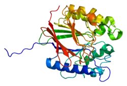 Tartrate-resistant acid phosphatase (TRAP or TRAPase), also called acid phosphatase 5, tartrate resistant (ACP5) or TRAP5b, is a glycosylated monomeric metalloprotein enzyme expressed in mammals.[5] It has a molecular weight of approximately 35kDa, a basic isoelectric point (7.6–9.5), and optimal activity in acidic conditions. TRAP is synthesized as latent proenzyme and activated by proteolytic cleavage and reduction.[6][7] It is differentiated from other mammalian acid phosphatases by its resistance to inhibition by tartrate and by its molecular weight.