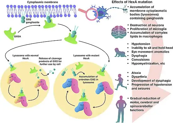 {{cite journal}}: CS1 maint: unflagged free DOI (link) - ↑ Mahuran DJ (1999). "Biochemical consequences of mutations causing the GM2 gangliosidoses". Biochimica et Biophysica Acta (BBA) - Molecular Basis of Disease. 1455 (2–3): 105–138. doi:10.1016/S0925-4439(99)00074-5. PMID 10571007.