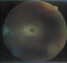 | Cherry-red spot as seen in the retina in Tay–Sachs disease. The fovea's center appears bright red because it is surrounded by a whiter than usual area. | |