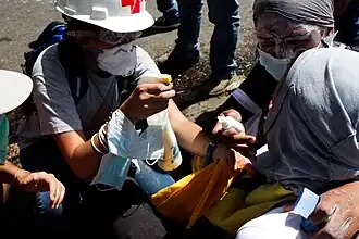 During the 2019 Hong Kong protests, frontline protesters became adept at extinguishing tear gas: they formed special teams that sprang into action as soon as it was fired. These individuals generally wore protective clothing, including heat-proof gloves, or covered their arms and legs with cling film to prevent the painful skin irritation. Canisters were sometimes picked up and lobbed back at police or extinguished straight away with water, or neutralized using objects such as traffic cones. They shared information about models of 3M respirator filters which had been found to be most effective against tear gas, and where those models could be purchased. Other volunteers carried saline solutions to rinse the eyes of those affected.[38] Similarly, Chilean protesters of Primera Línea had specialized individuals collecting and extinguishing the tear gas grenades. Others acted as tear gas medics, and another group, the "shield-bearers," protected the protesters from the direct physical impact of the grenades.[39]