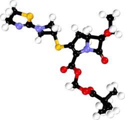Tebipenem (brand name Orapenem) is a broad-spectrum orally-administered antibiotic, from the carbapenem subgroup of β-lactam antibiotics. It was developed as a replacement drug to combat bacteria that had acquired antibiotic resistance to commonly used antibiotics.[1][2] Tebipenem is formulated as the ester tebipenem pivoxil due to the better absorption and improved bioavailability of this form.[3] It has performed well in clinical trials for ear infection and looks likely to be further developed in future.[4] It is only marketed in Japan.[5] Tebipenem is the first carbapenem whose prodrug form, the pivalyl ester, is orally available.[6]