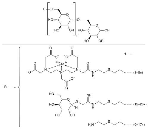 | Formula | (C6H10O5)n(C19H28N4O9S99mTc)3–8(C13H24N2O5S2)12–20(C5H11NS)0–17 |