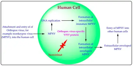 Tecovirimat inhibits the function of a major envelope protein required for the production of extracellular virus. The drug prevents the virus from leaving an infected cell, hindering the spread of the virus within the body.[11]