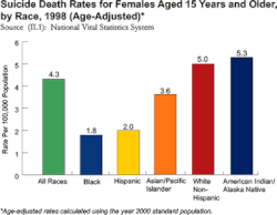 Suicide rates vary for different ethnic groups. In 1998, suicides among European Americans accounted for 84% of all youth suicides, 61% male and 23% female. The suicide rate for Native Americans was 19.3 per 100,000, much higher than the overall rate of 8.5 per 100,000. The suicide rate for African Americans has increased more than twofold since 1981. A national survey of high school students conducted in 1999 reported that Hispanic students are twice as likely to report attempted suicide as white students.[8]