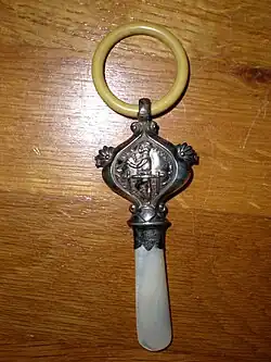 Teething toys have a long history. In England in the 17th–19th centuries, a coral meant a teething toy made of coral, ivory, or bone, often mounted in silver as the handle of a rattle.[28] A museum curator has suggested that these substances were used as sympathetic magic,[29] and that the animal bone could symbolize animal strength to help the child cope with pain.